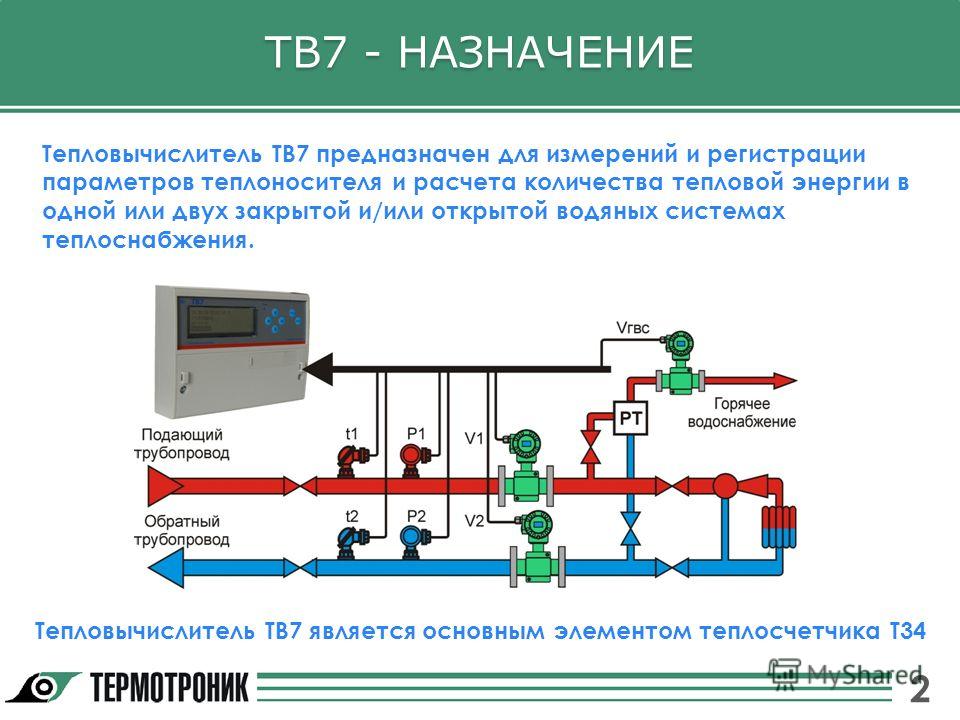 Тепловычислитель ТВ7 является основным элементом теплосчетчика Т34 Тепловычислитель ТВ7 предназначен для измерений и регистрации параметров теплоносителя и расчета количества тепловой энергии в одной или двух закрытой и/или открытой водяных системах теплоснабжения.